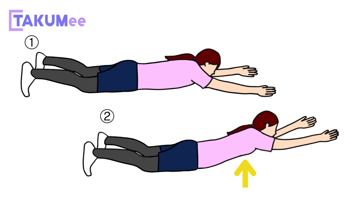 - 真っ直ぐうつ伏せになり、両手を前に伸ばす