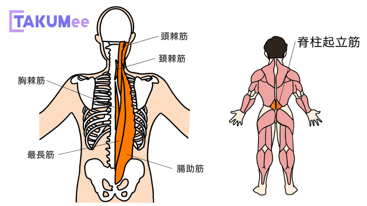 腸肋筋・最長筋・胸棘筋・頭棘筋・頚棘筋の5つの筋肉から構成されており、正しい姿勢を維持するのに大きな役割を担っています。