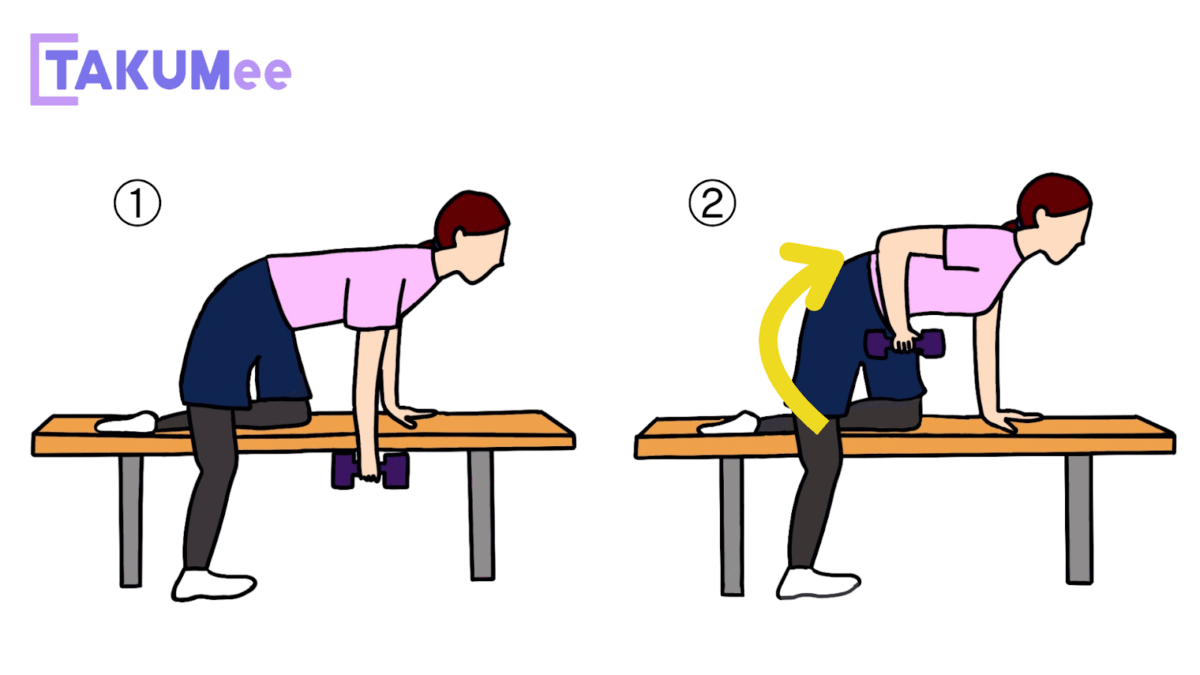 - 骨盤の高さまでダンベルを引いて、背中の筋肉を縮める