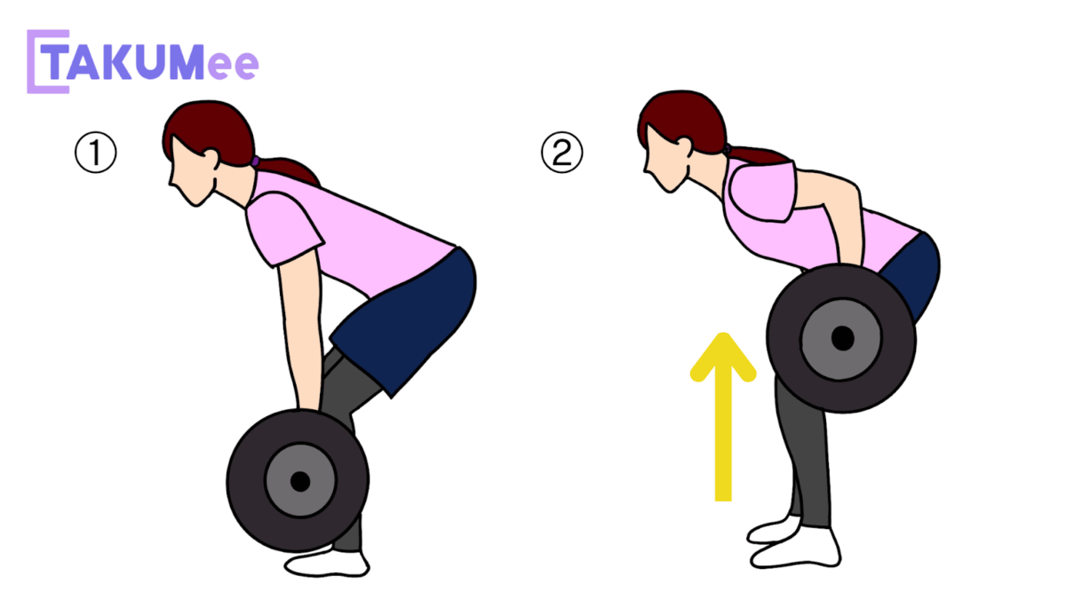 (背筋を伸ばした状態を保つ) - バーベルを足の付け根に向かって引き上げる