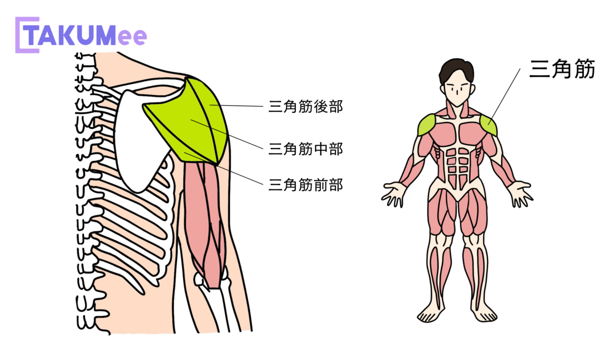 三角筋(さんかくきん)は、肩まわりの大きな筋肉です。