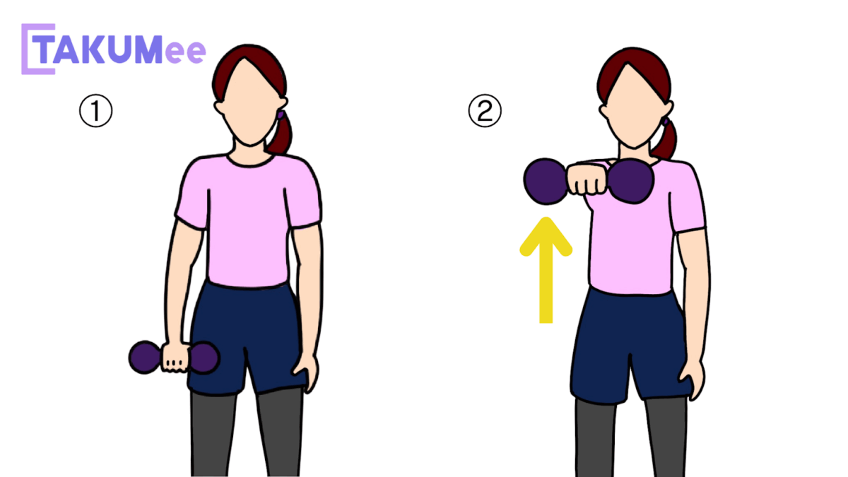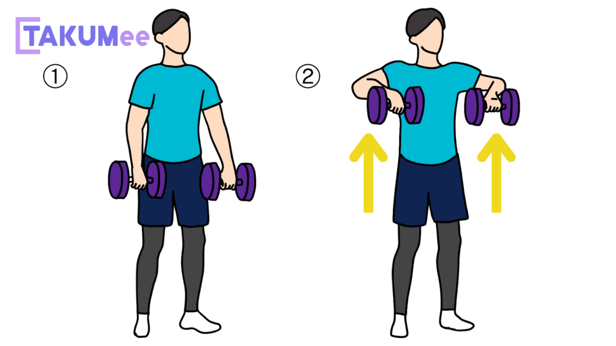 - 肘を曲げながらダンベルを肩の高さまで持ち上げる